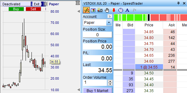 The Future VSTOXX is a contract that expires monthly. If you wish to keep a long-term position on the Future VSTOXX, you must arrange to roll the position once a month. The size of a Future VSTOXX is relatively modest. Indeed, a VSTOXX Future quotes 34.55 points (see example below) and one point of a VSTOXX Future is worth EUR 100, so the nominal value of a VSTOXX Future is EUR 3455. This modest size is convenient to protect portfolios whose value is close to a few tens or hundreds of thousands of euros. Daytime margins are EUR 450 and night-time margins are EUR 1300. The Future VSTOXX is traded Monday to Friday between 8am and 10pm. Its order book is very liquid as can be seen below.
