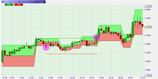 A trader using the Mogalef bands must open both a 5-minute and a 30-minute chart. The signals are generated on the 5-minute chart. The 30-minute chart acts as a trend filter. The trend filter colours the complete chart background green, when the trend is bullish, and red, when the trend is bearish. The trend filter automatically blocks short sell signals in a bullish market and buy signals in a bearish market.