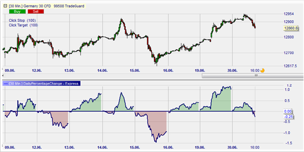Many traders use a particular period during the trading session as a guideline for their trading during the rest of the day. For example a trader might analyse the market activity during the first 30 minutes of trading to get an idea of the sentiment on the trading floor. Day Comparer allows you to determine the exact period you would like to see via the TradingTime Filter in the Symbol Details. In this example the TradingTime Filter would be set up to start at 15.30 and end at 16.00.
