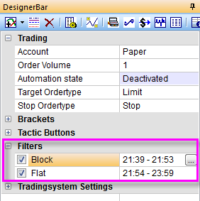 This example shows the filter settings for the trader who does not want to open any new positions 20 minutes before the market close and who wants to close any open position 5 minutes before the market close.