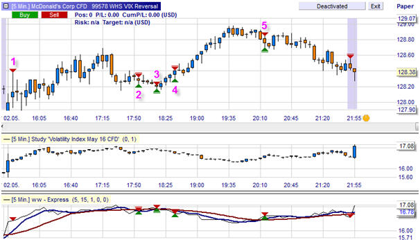 This example shows a trading day on McDonald’s. There are a total of 5 signals: 2 buy signals and 3 short sell signals. The strategy is either always long or short i.e. a short position is closed by opening a long position and vice versa. The final short position is closed automatically by the platform just before the market closes. The second window shows the VIX. The third window shows Carr’s signal based on the VIX. The fourth window shows the trader’s equity curve. The first three trades make a loss but the loss is made good by the 4th and the 5th trading signal. At the end of the day the result is positive.